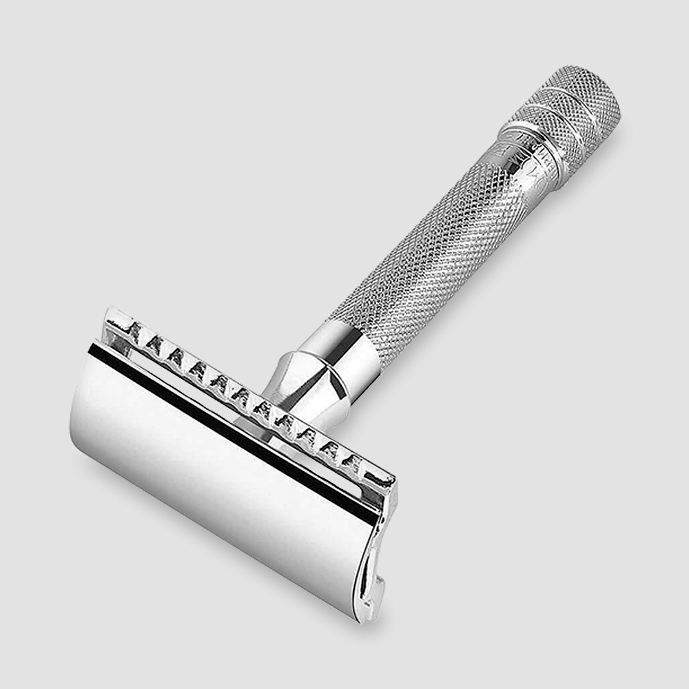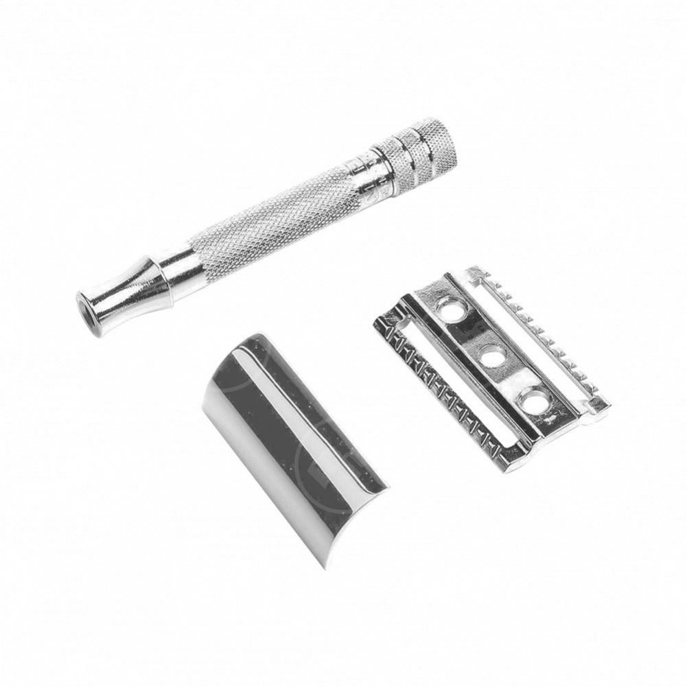 Головка безопасной бритвы изготовлена с использованием процесса литья под давлением из цинка, так как он позволяет создавать инструменты с максимальной точностью даже для сложных форм. Чтобы обеспечить комфортное распределение веса, используется только латунь для ручки. Хромированная отделка защищает бритву от коррозии и подчеркивает высококачественный дизайн.