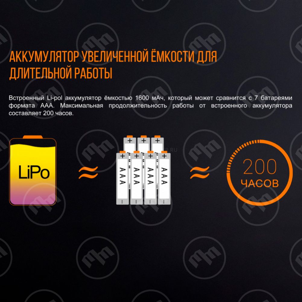 • Встроенный литий-полимерный аккумулятор 1600 мАч, зарядка через кабель USB составляет 1 час 40 минут при выключенном фонаре