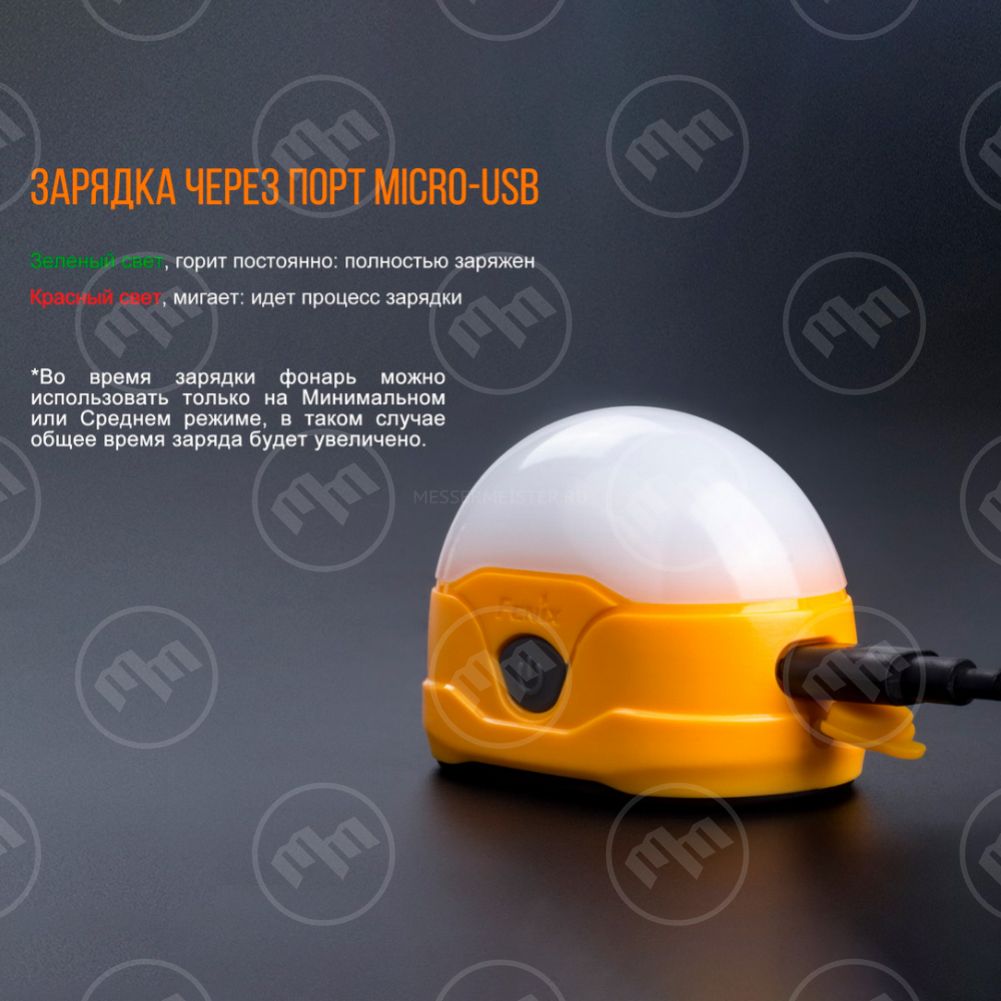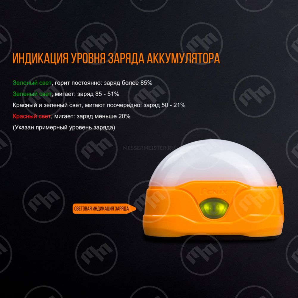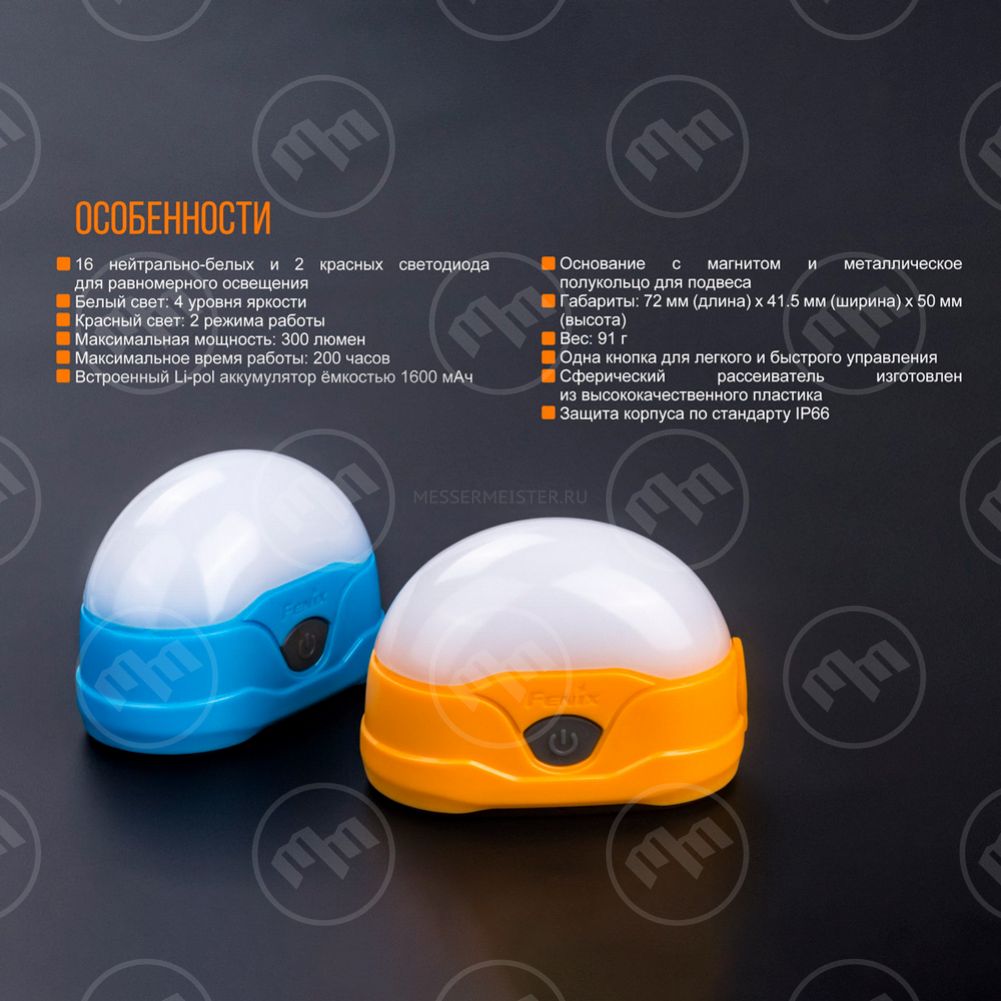 Кемпинговые фонари Fenix дифференцируются по размеру и степени освещения. Здесь есть небольшие компактные варианты, предназначенные для освещения палатки или места одного человека, а есть и довольно объемные модели, способные осветить значительный участок лагеря. Все они оснащены светодиодными лампами. Кемпинговые фонари Fenix имеют несколько режимов работы. В зависимости от необходимости они могут обеспечить приглушенный рассеянный свет или мощное, сильное излучение. Кроме того, ряд моделей оснащается красным или зеленым светом, что позволяет расширить сферу применения изделий. Для удобства установки фонари комплектуются верхней ручкой или магнитным основанием, благодаря которому можно разместить прибор даже на наклонной металлической поверхности. Заряжаются батареи от стандартного разъема через шнур USB, а некоторые изделия могут служить переносным источником питания для гаджетов.