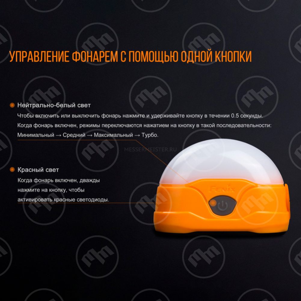 • Фонарь управляется одной кнопкой
