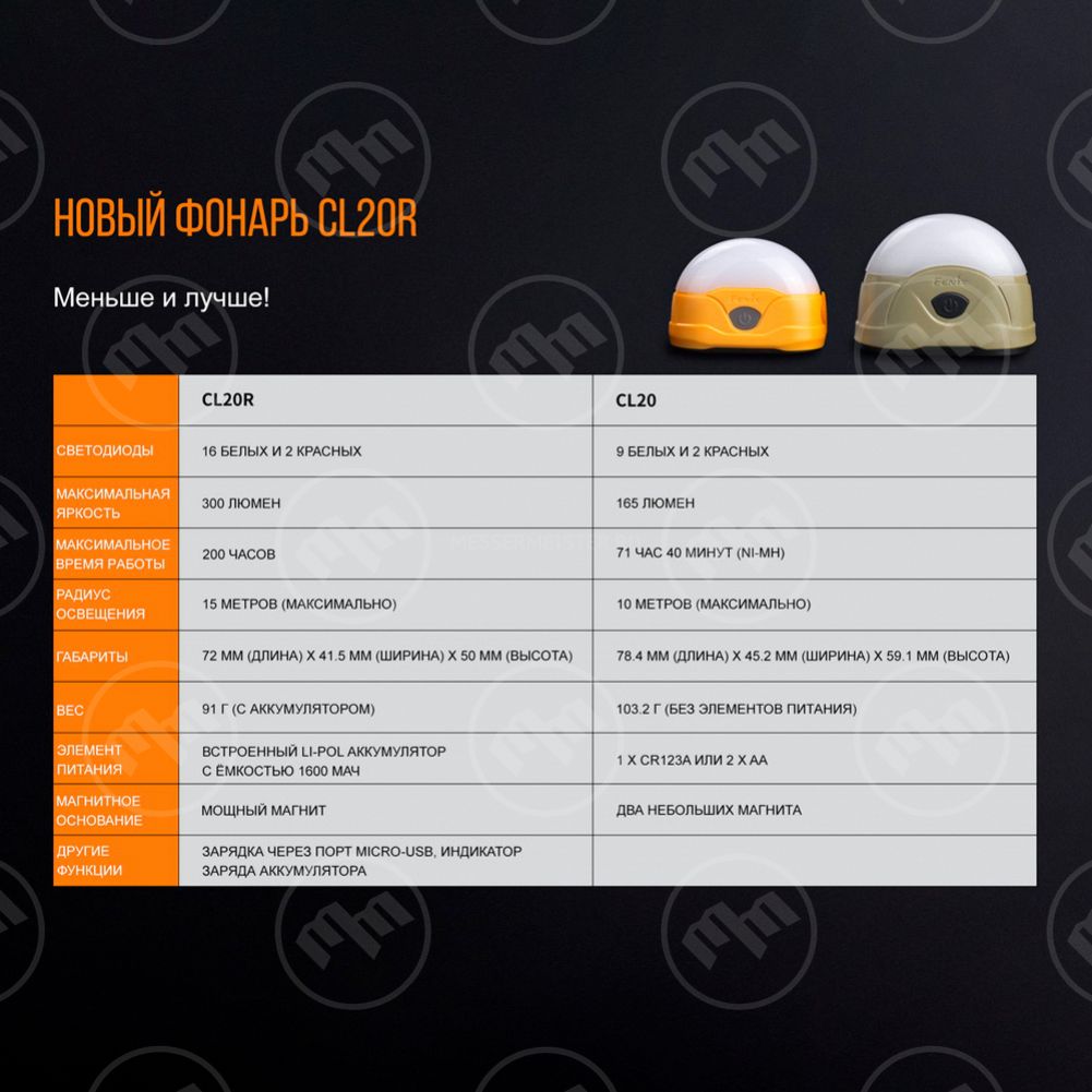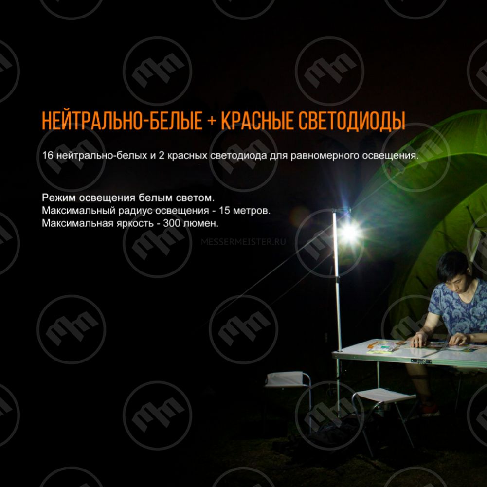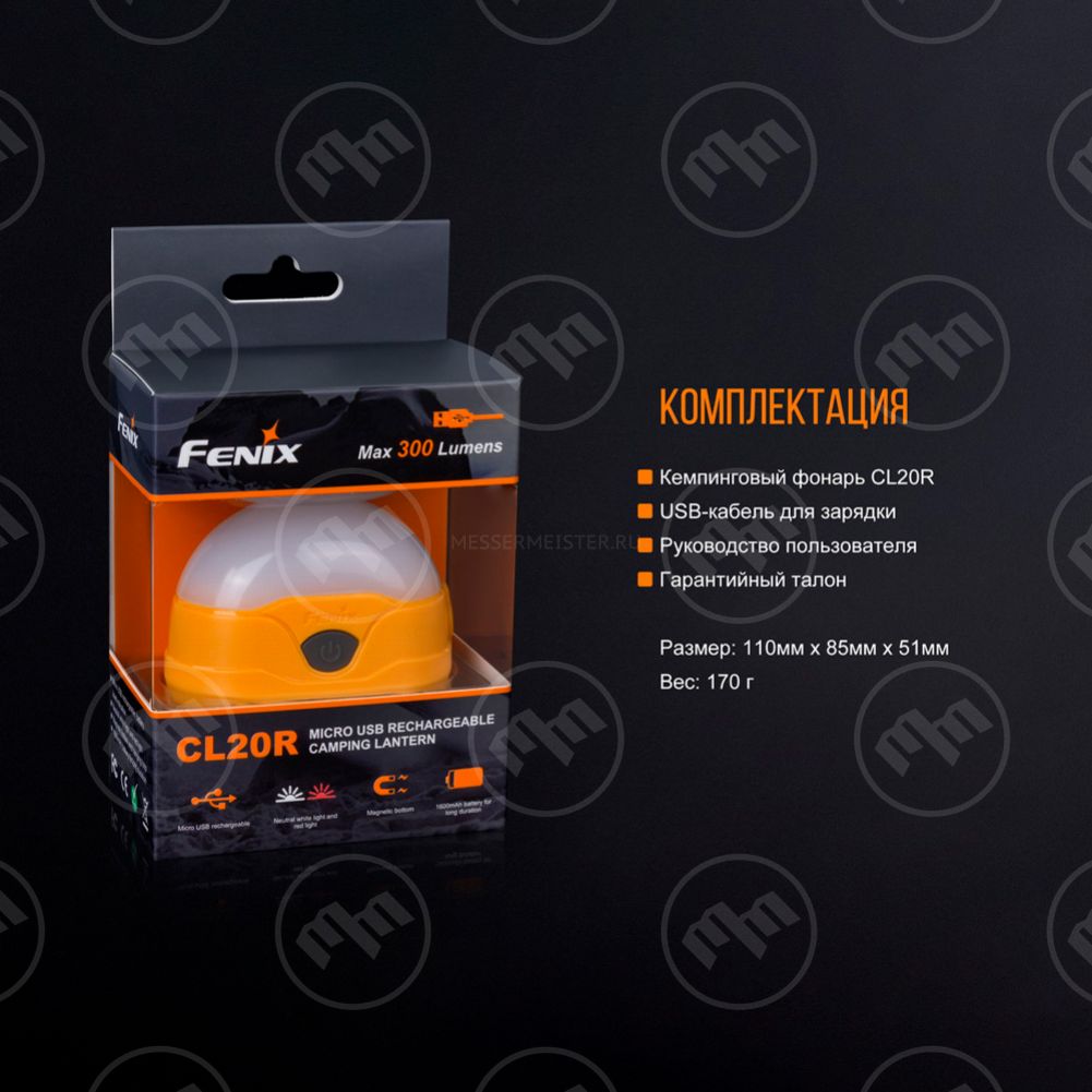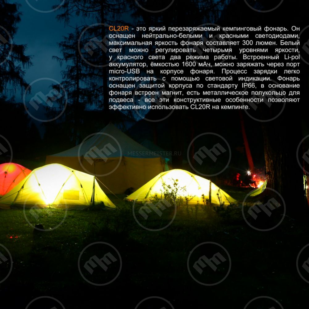 Специально для любителей походов инженеры компании выпустили линейку фонарей с условным обозначением CL (Camping Light). Особую популярность завоевали модели CL20 (полусфера на плоской основе, оснащенная выпуклой передней линзой и одиннадцатью светодиодами) и CL25 (мощность 350 люмен, несколько вариантов крепления к разным поверхностям, защита от грязи и воды). Рассмотрите их поближе в каталоге интернет-магазина MesserMeister и сделайте выбор, зная, что фонарь Fenix станет вашим лучшим помощником во время вылазки на природу с друзьями, на рыбалке и в туристическом лагере.