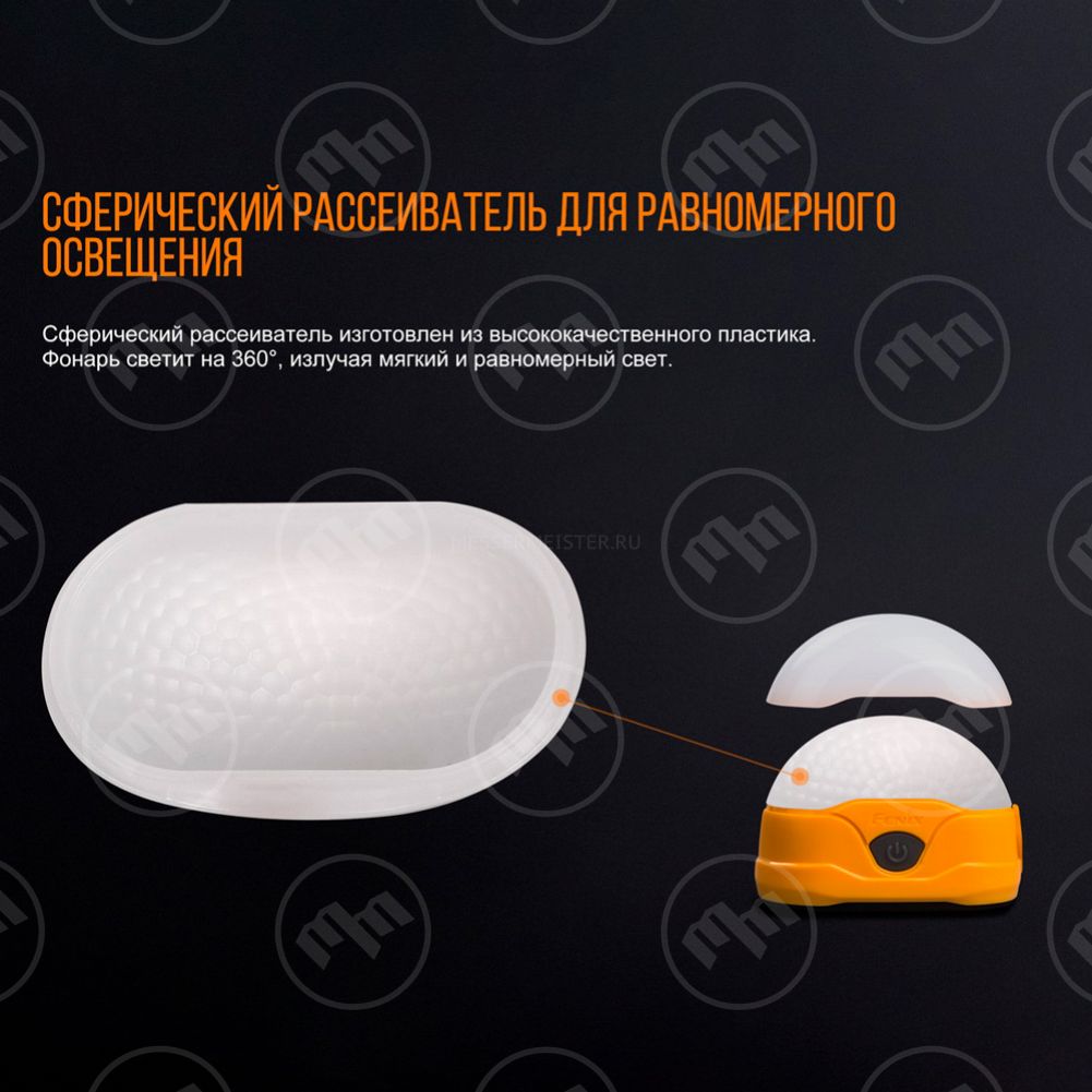 • Сферический рассеиватель позволяет освещать пространство на 360°