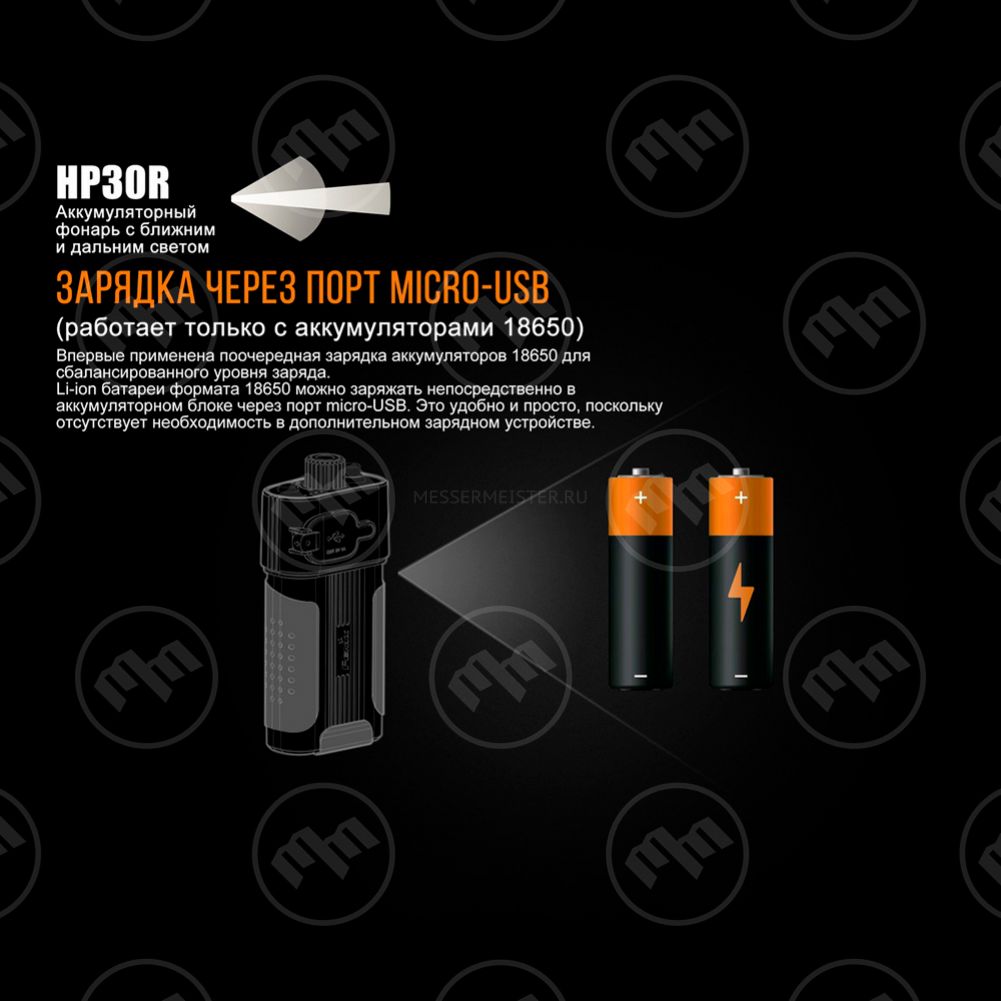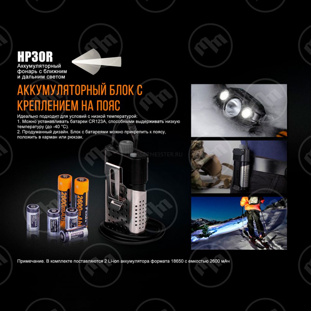 • Питание от двух аккумуляторов 18650 или четырех CR123A