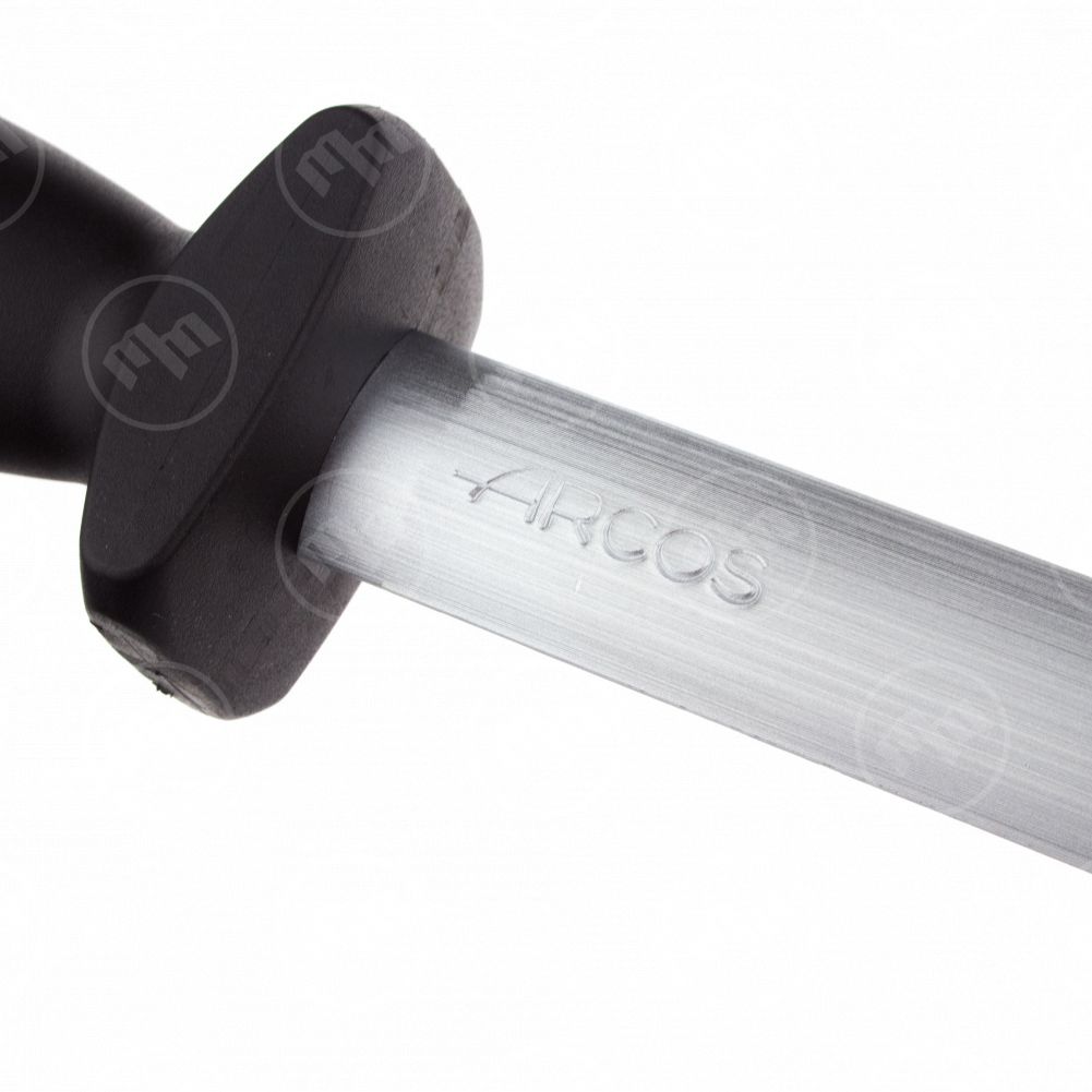 Итальянские приспособления для заточки Arcos по своему внешнему виду напоминают напильники длиной от 23 до 30 сантиметров с круглым сечением и имеют надежную рукоятку из полиоксиметилена. Петелька на ручке позволяет удобно хранить мусат в подвешенном состоянии.