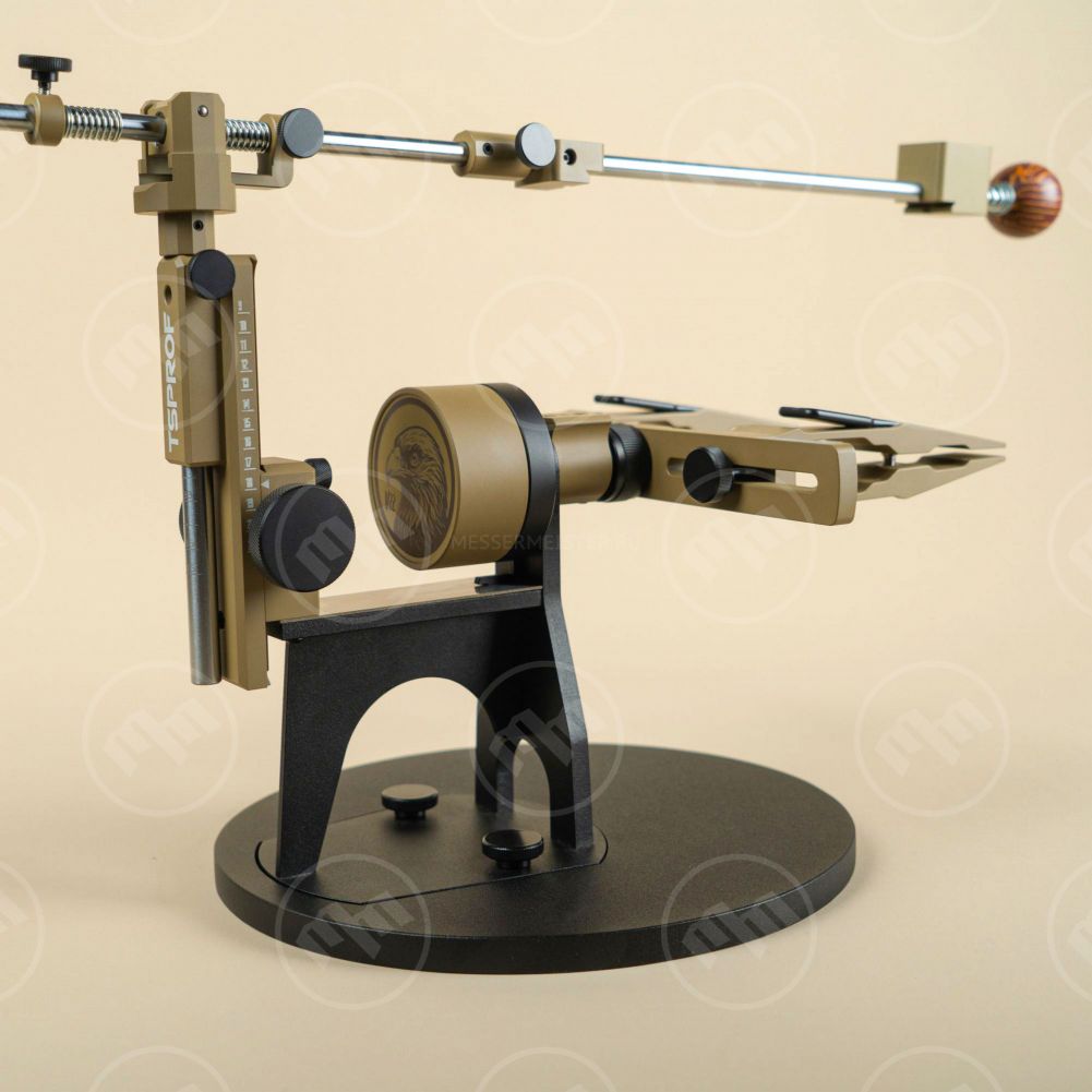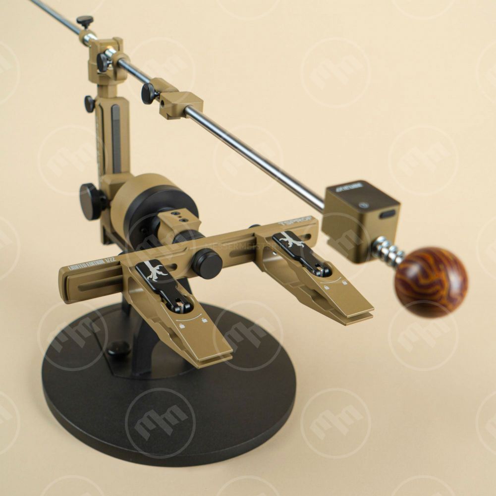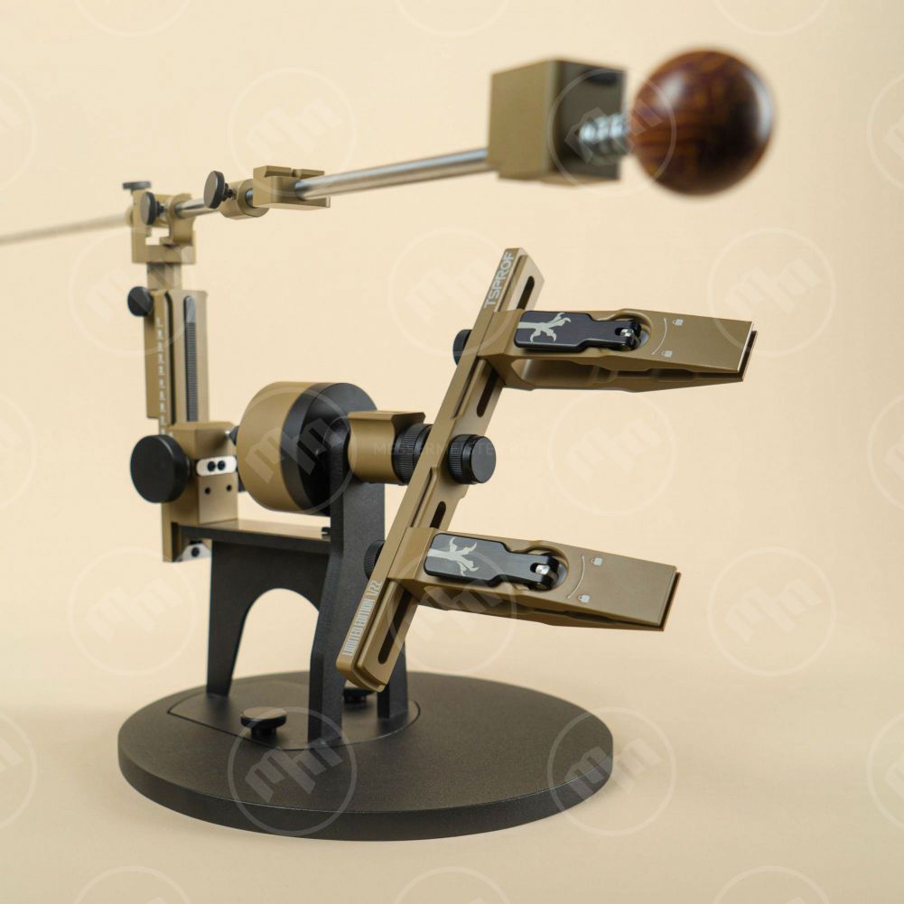 Ключевые элементы комплекта включают систему заточки Профиль К03 в кастомной покраске Cerakote c высокоэффективными зажимами TSPROF Quick, направляющую держателя абразива украшает рукоятка-шар из материала Crazy Fiber.