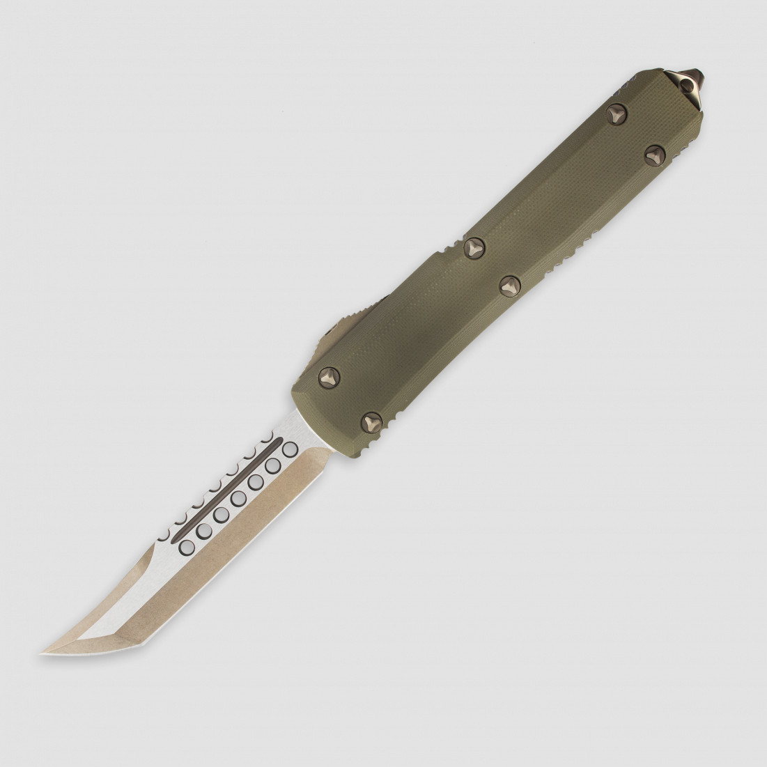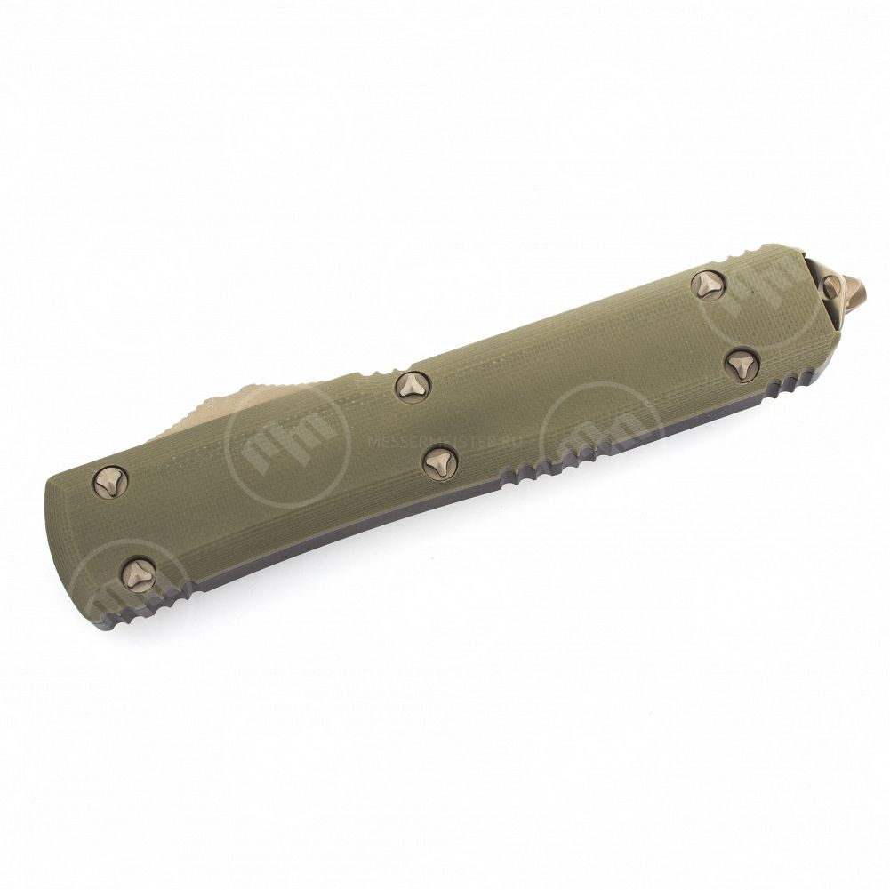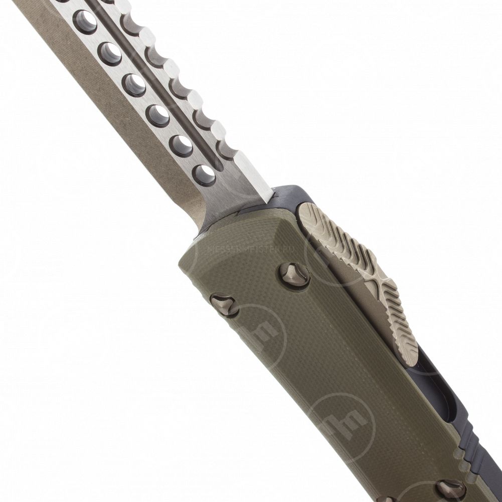 Тип замка на моделях, ставший фирменным out-the-front double auto. Тип покрытия клинка, также характерный только для Microtech stonewash + bronze dlc, обеспечит отсутствие царапин и придаст сверкающий эффект лезвию. От предыдущих моделей ножи отличаются ещё и по дизайну – на клинке над долами использованы "machine holes" или иначе – перфорация. Выглядит очень необычно и брутально, при этом облегчает клинок и добавляет ему скольжения. По собственным ощущениям – просто невероятные ножи, которые вызывают сплошной восторг.