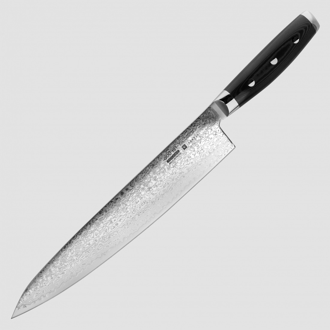 1. GOU — сверхострая режущая кромка из порошковой стали SG2, дамасские обкладки из 50 слоев с каждой стороны, твердость до 63 единиц по Роквеллу, наконечник из медицинской стали 18/10 с гравировкой, рукоять из микарты.