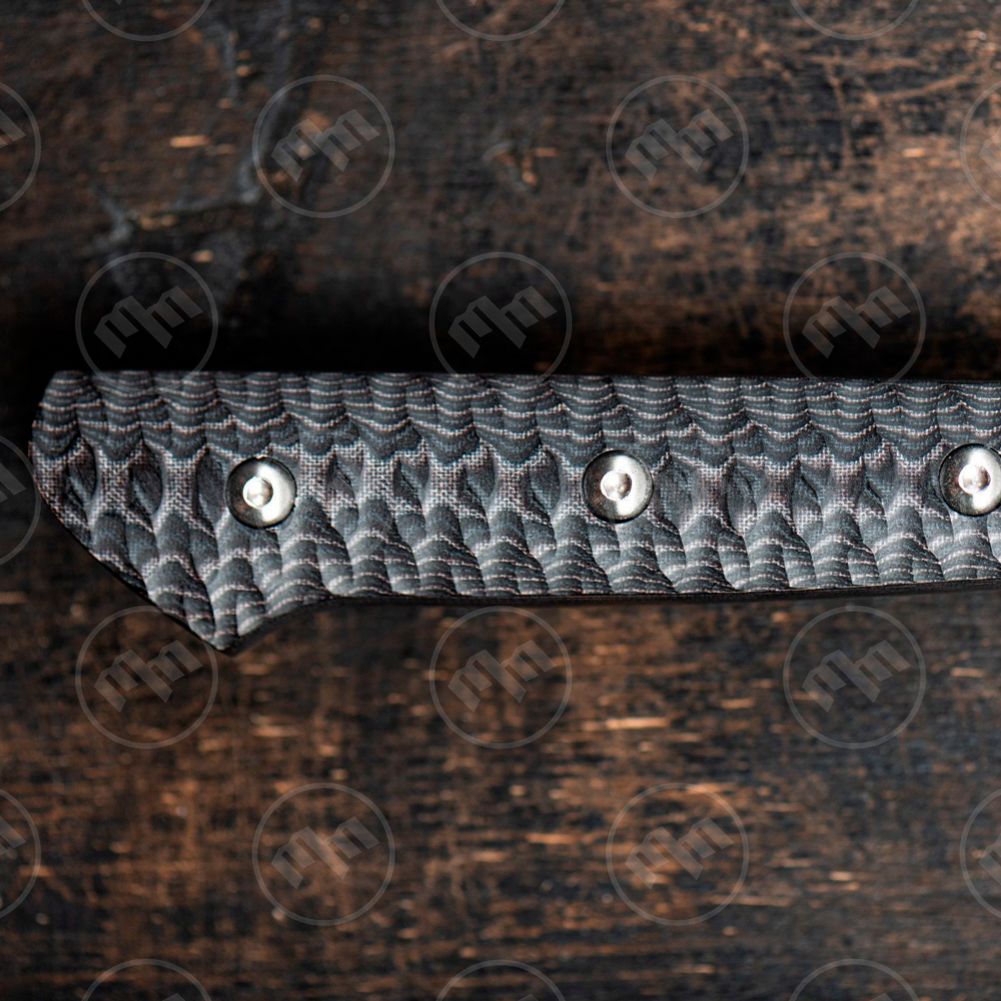 Ручка изготовлена из Микарты, которая отличается прочностью, хорошей коррозионной стойкостью и устойчивостью к износу со временем. Уникальная шероховатая поверхность не позволяет ножу соскальзывать с рук.
