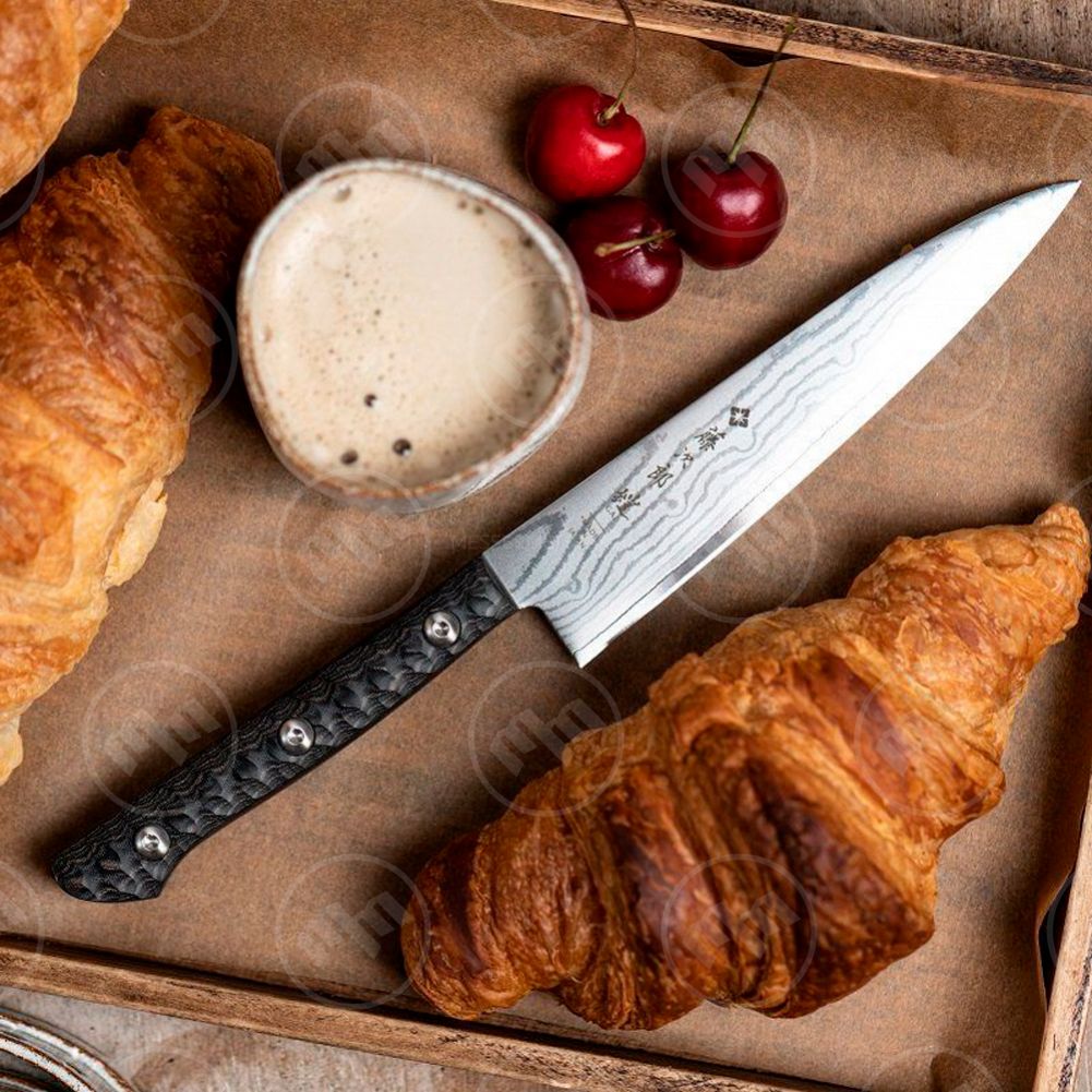 Клинок данной серии дамасский, выполнен из VG10 - японская ножевая сталь премиум-класса - в сердечнике, выкованном из 37 слоев низко- и высокоуглеродистой нержавеющей стали, с рукояткой уникальной конструкции и прочной поверхностью, закрепленной шестигранными болтами.
