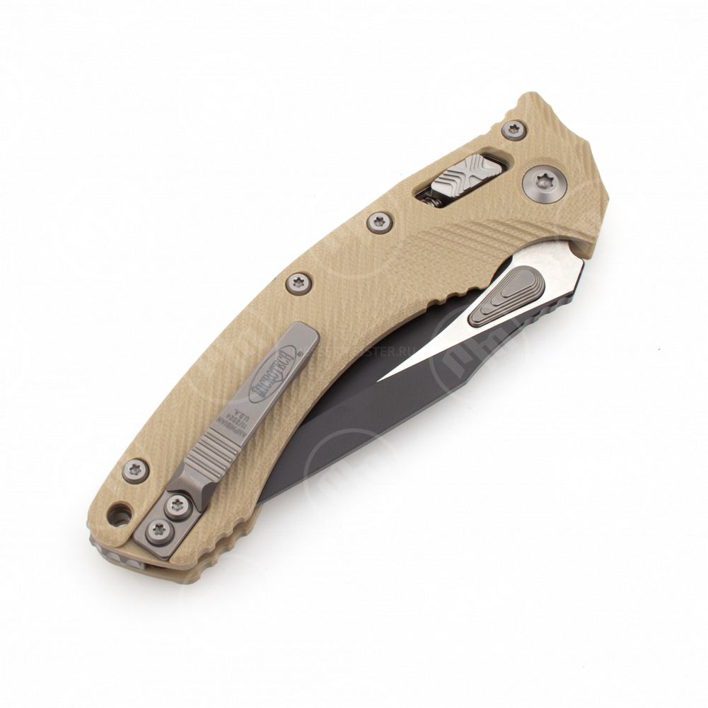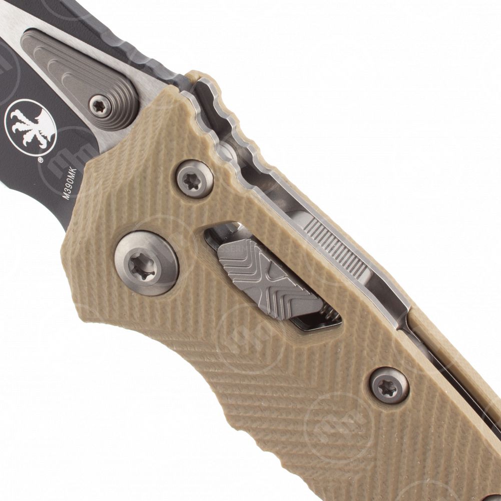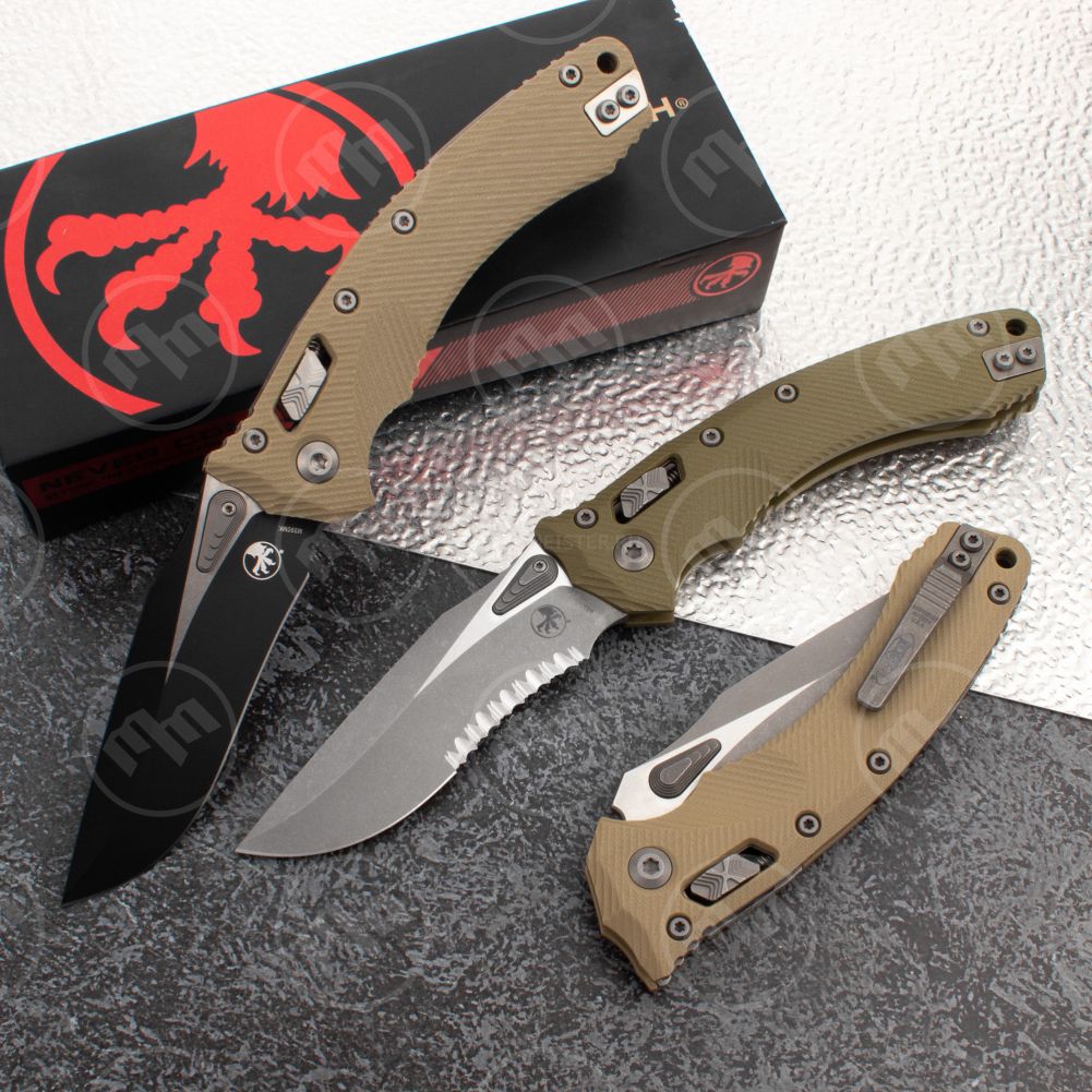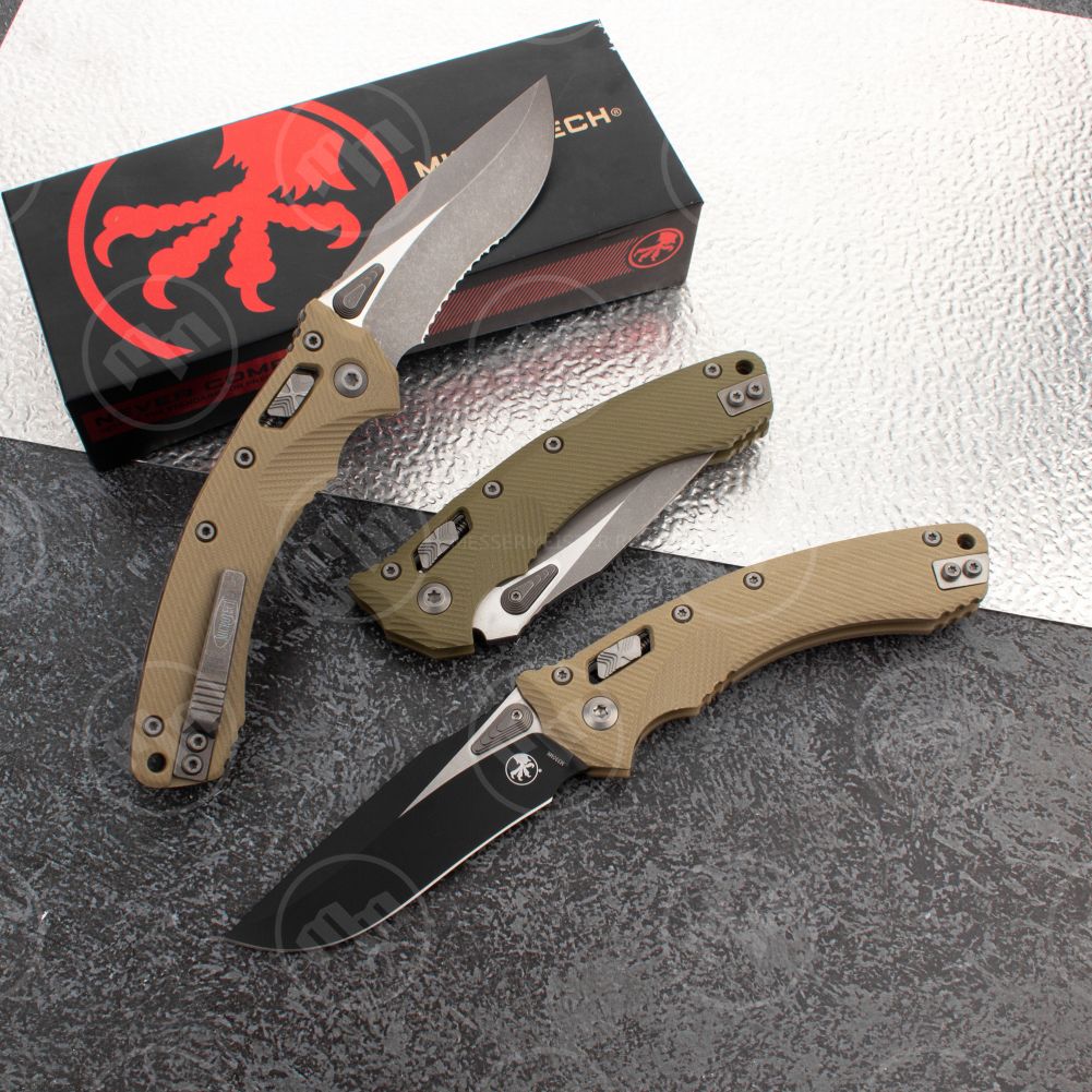 Складные ножи без автоматического формата раскладывания производителя Microtech преимущественно представлены изделиями коллекции серии Socom. Входящие сюда подкатегории Socom Elite Tanto, Socom Elite Clip Point, Socom Delta, Socom Elite и прочие выполнены в едином дизайне и оборудованы одинаковым механизмом раскладывания. В ножах Microtech использовался наиболее простой и надежный замок — liner lock. В этой конструкции предусмотрена металлическая планка — лайнер, которая располагается между плашек и фиксирует клинок в разложенном положении передней частью, а в сложенном служит прижимом. В ряде авторских изделий, таких как Socom Delta или DOC, применяется frame lock — модифицированный liner lock, в котором лайнером служит часть плашки рукояти.