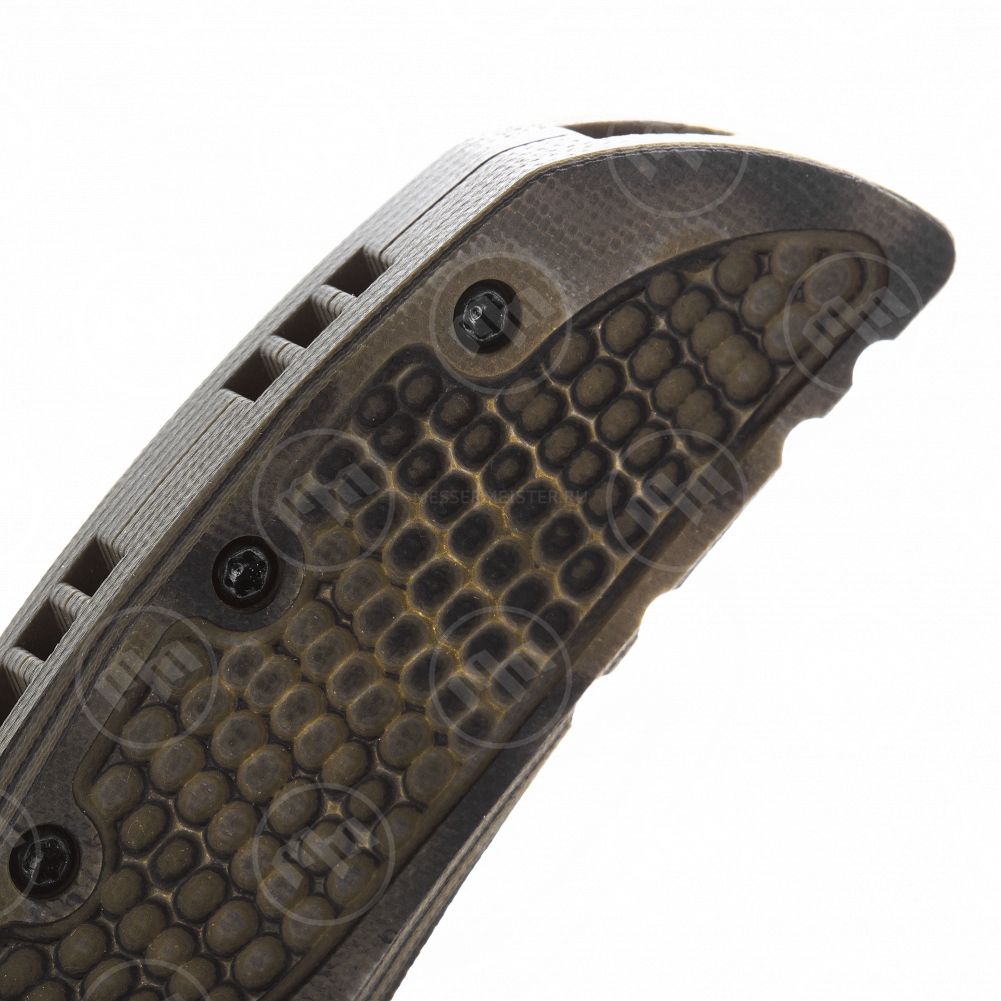 Для ношения на кармане или петлях снаряжения нож снабжен крупной стальной клипсой с логотипом компании. На первый взгляд клипса может показаться неудобной из-за своего значительного размера, однако эта не стандартная клипса, а тщательно проработанная деталь конструкции именно этого ножа. С завода она установлена на правой стороне рукояти ближе к её началу и такое положение имеет особый смысл. В этом положении клипса участвует в режущем хвате ножа, придавая дополнительную толщину рукояти и точно обозначая место куда максимально удобно положить указательный палец правой руки. Впрочем, если Вы предпочитаете носить нож в кармане кончиком вверх и любите чтобы в области осевого узла рукоять была плоской, вы легко можете переставить клипсу ближе к навершию, где также смонтированы латунные втулки с резьбой. Такие посадочные места для клипсы встречаются довольно редко – обычно предполагается закручивать винты прямо в стеклотекстолит. Еще один продуманный и дорого исполненный элемент конструкции ножа, благодаря которому пользователь может переставлять клипсу практически бесконечное количество раз, не нанося урона рукояти.