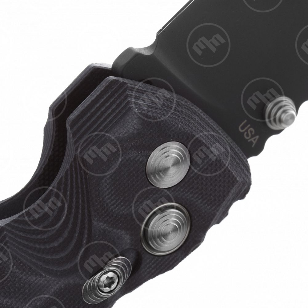 Для ношения на кармане или петлях снаряжения нож снабжен крупной стальной клипсой с логотипом компании. На первый взгляд клипса может показаться неудобной из-за своего значительного размера, однако эта не стандартная клипса, а тщательно проработанная деталь конструкции именно этого ножа. С завода она установлена на правой стороне рукояти ближе к её началу и такое положение имеет особый смысл. В этом положении клипса участвует в режущем хвате ножа, придавая дополнительную толщину рукояти и точно обозначая место куда максимально удобно положить указательный палец правой руки. Впрочем, если Вы предпочитаете носить нож в кармане кончиком вверх и любите чтобы в области осевого узла рукоять была плоской, вы легко можете переставить клипсу ближе к навершию, где также смонтированы латунные втулки с резьбой. Такие посадочные места для клипсы встречаются довольно редко – обычно предполагается закручивать винты прямо в стеклотекстолит. Еще один продуманный и дорого исполненный элемент конструкции ножа, благодаря которому пользователь может переставлять клипсу практически бесконечное количество раз, не нанося урона рукояти.