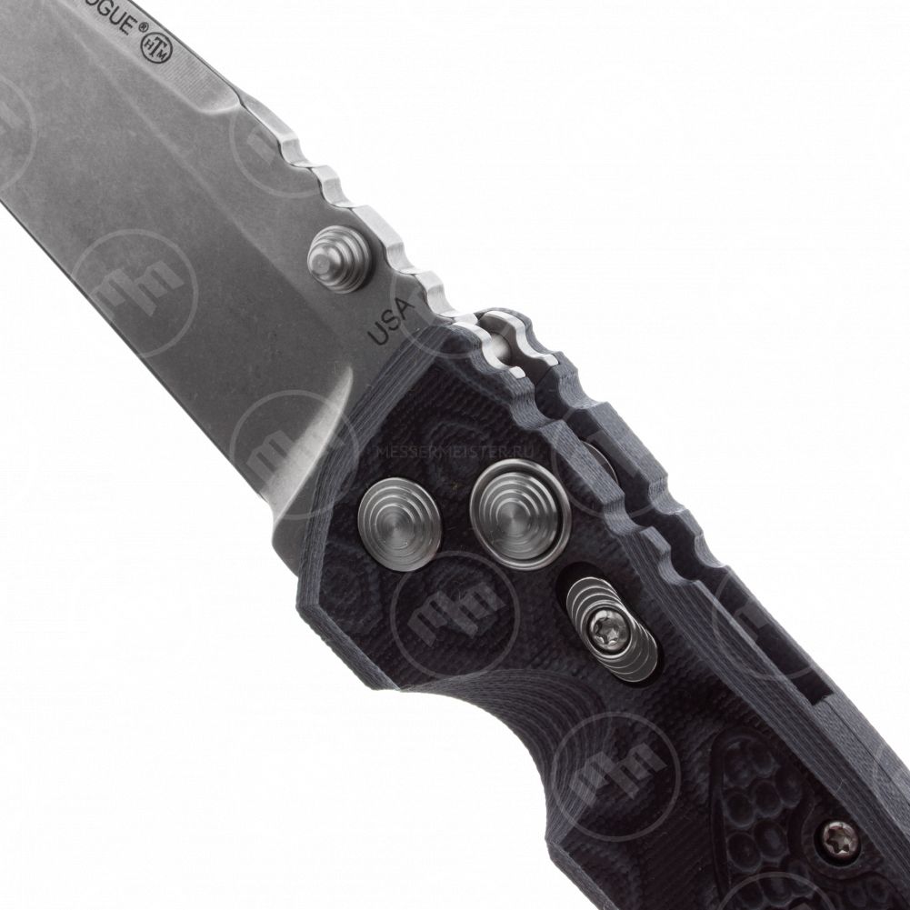 Клинок полностью соответствует общей концепции ножа. С одной стороны у него довольно прочный кончик и толщина в обухе 3,8 миллиметра. С другой стороны, благодаря высоким спускам и действительно тонкому (около 0,3 миллиметра) сведению нож комфортно режет даже продукты. Компания Hogue очень гордится тем, что использует в своих изделиях только компоненты, произведенные в США, и именно по этой причине сталь клинка, это настоящая американская классика последних десятилетий – 154СМ, закалённая на твёрдость в 59 единиц по шкале Роквелла. Клинок и шпеньки ножа галтованы, благодаря чему чрезвычайно трудно испортить в работе внешний вид этих элементов. Кроме того, галтовка уместно выглядит на фоне рукояти из G-Mascus и придаёт ножу дополнительную эстетику функционального инструмента.
