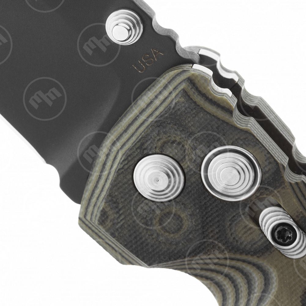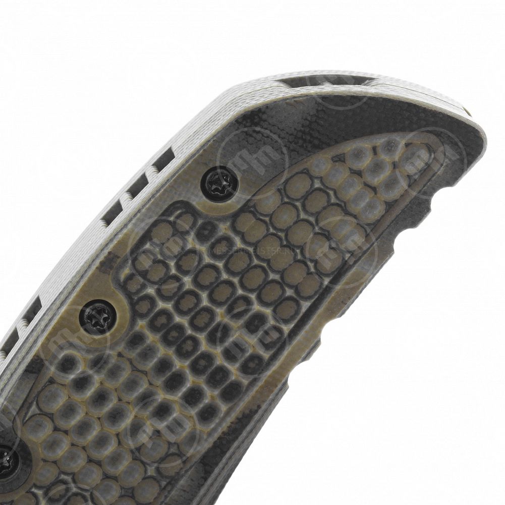 Для ношения на кармане или петлях снаряжения нож снабжен крупной стальной клипсой с логотипом компании. На первый взгляд клипса может показаться неудобной из-за своего значительного размера, однако эта не стандартная клипса, а тщательно проработанная деталь конструкции именно этого ножа. С завода она установлена на правой стороне рукояти ближе к её началу и такое положение имеет особый смысл. В этом положении клипса участвует в режущем хвате ножа, придавая дополнительную толщину рукояти и точно обозначая место куда максимально удобно положить указательный палец правой руки. Впрочем, если Вы предпочитаете носить нож в кармане кончиком вверх и любите чтобы в области осевого узла рукоять была плоской, вы легко можете переставить клипсу ближе к навершию, где также смонтированы латунные втулки с резьбой. Такие посадочные места для клипсы встречаются довольно редко – обычно предполагается закручивать винты прямо в стеклотекстолит. Еще один продуманный и дорого исполненный элемент конструкции ножа, благодаря которому пользователь может переставлять клипсу практически бесконечное количество раз, не нанося урона рукояти.