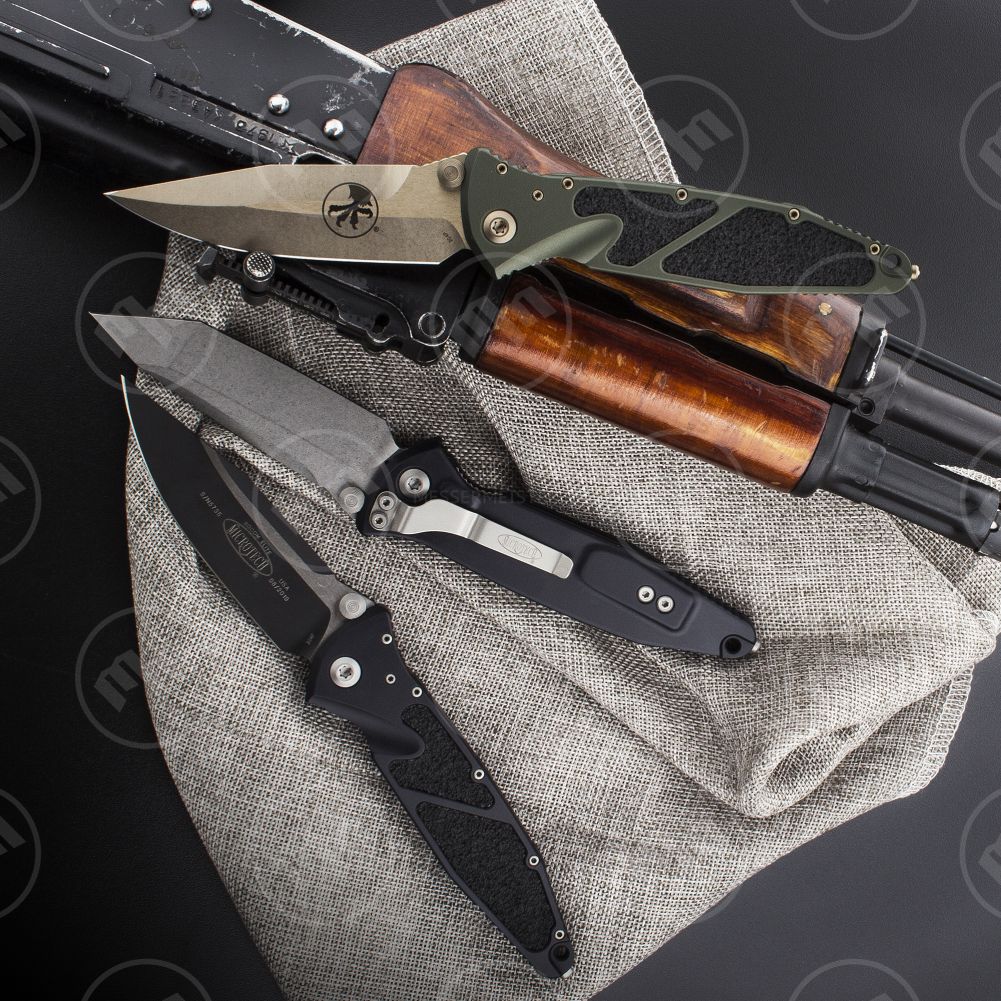 Тип замка на моделях, ставший фирменным out-the-front double auto. Тип покрытия клинка, также характерный только для Microtech stonewash + bronze dlc, обеспечит отсутствие царапин и придаст сверкающий эффект лезвию. От предыдущих моделей ножи отличаются ещё и по дизайну – на клинке над долами использованы "machine holes" или иначе – перфорация. Выглядит очень необычно и брутально, при этом облегчает клинок и добавляет ему скольжения. По собственным ощущениям – просто невероятные ножи, которые вызывают сплошной восторг.