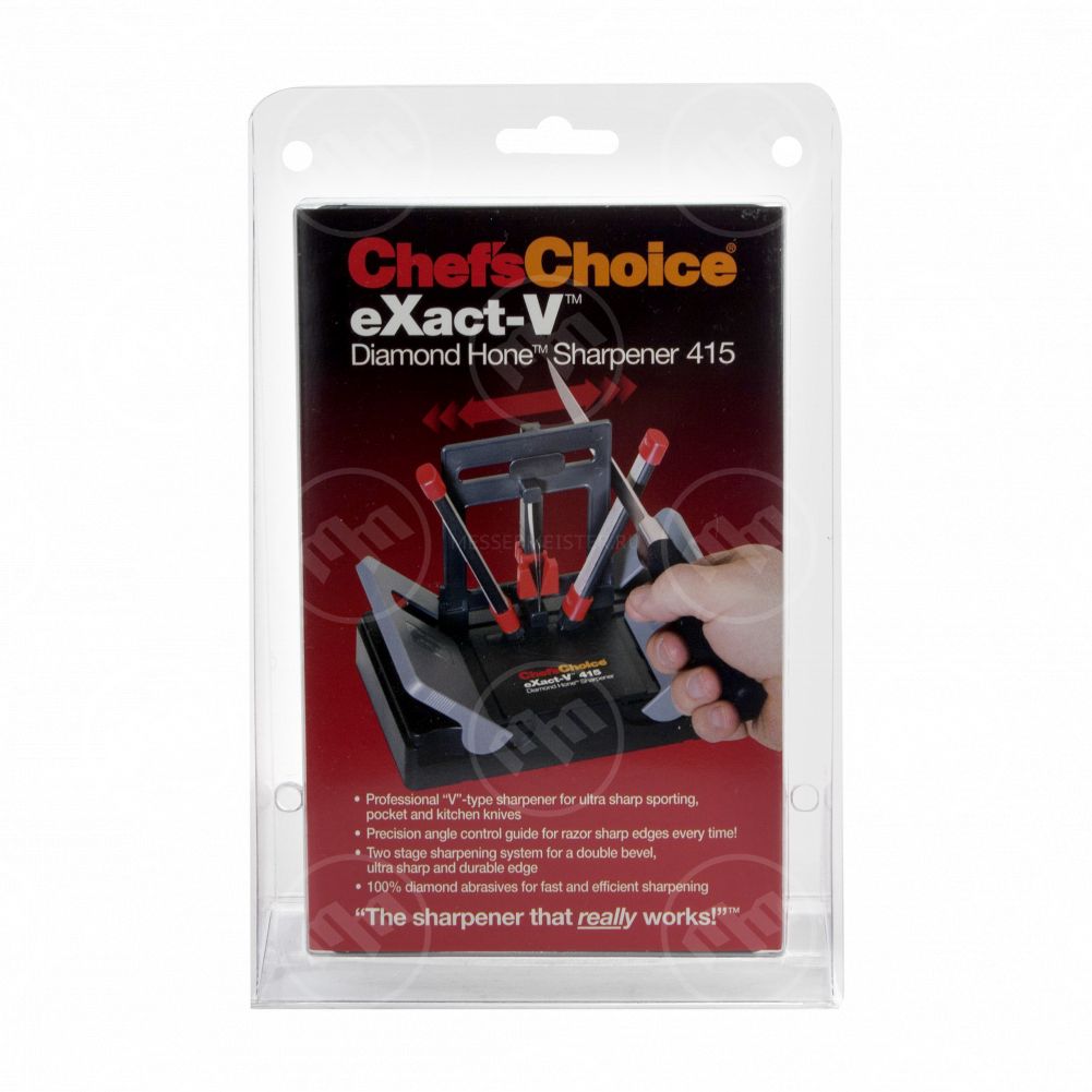 Точилка Chef’sChoice® Diamond Hone® eXact-V® Sharpener Model 415 является двухступенчатой системой для заточки, она оснащена 100% алмазными абразивами.